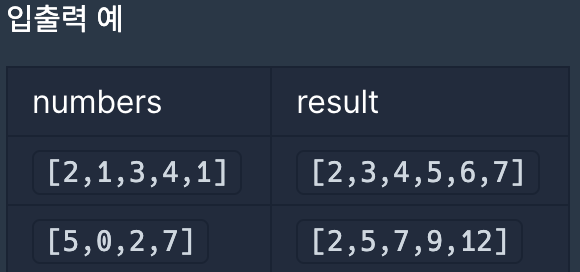 정수 배열 numbers가 주어집니다. numbers에서 서로 다른 인덱스에 있는 두 개의 수를 뽑아 더해서 만들 수 있는 모든 수를 배열에 오름차순으로 담아 return 하도록 solution 함수를 완성해주세요.