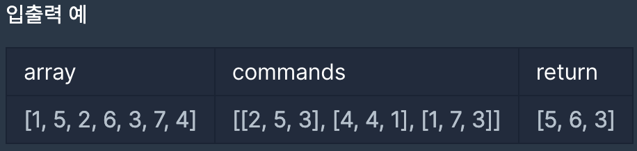 배열 array, [i, j, k]를 원소로 가진 2차원 배열 commands가 매개변수로 주어질 때, commands의 모든 원소에 대해 앞서 설명한 연산을 적용했을 때 나온 결과를 배열에 담아 return 하도록 solution 함수를 작성해주세요.