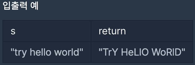 문자열 s는 한 개 이상의 단어로 구성되어 있고, 각 단어는 하나 이상의 공백문자로 구분되어 있습니다. 각 단어의 짝수번째 알파벳은 대문자로, 홀수번째 알파벳은 소문자로 바꾼 문자열을 리턴하는 solution 함수를 완성하세요.